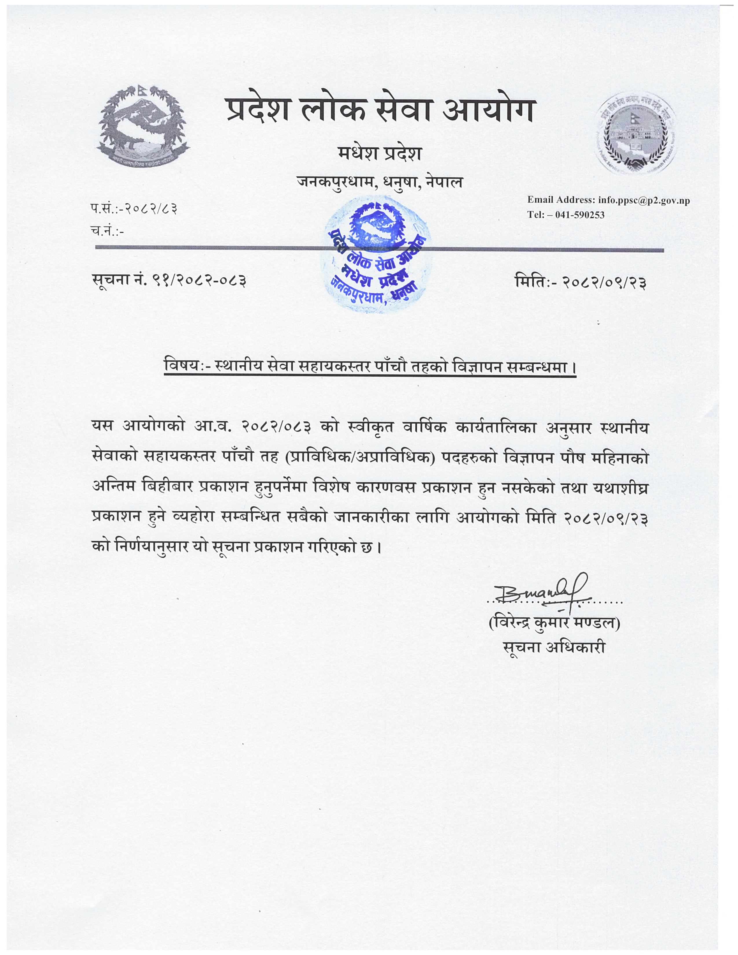 स्थानीय सेव अन्तर्गत अप्राविधिक तथा प्राविधिक तर्फका अधिकृतस्तर नवौं तहका पदहरुको बढुवा,खुला तथा समावेशी र अन्तर तहको विज्ञापन